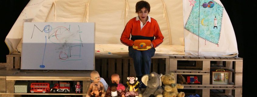 Sami va nous faire revivre les grands événements de sa petite vie, invitant quelques adultes, famille, nounous, au gré d’imitations savoureuses, manipulant objets et jouets pour animer ses souvenirs.