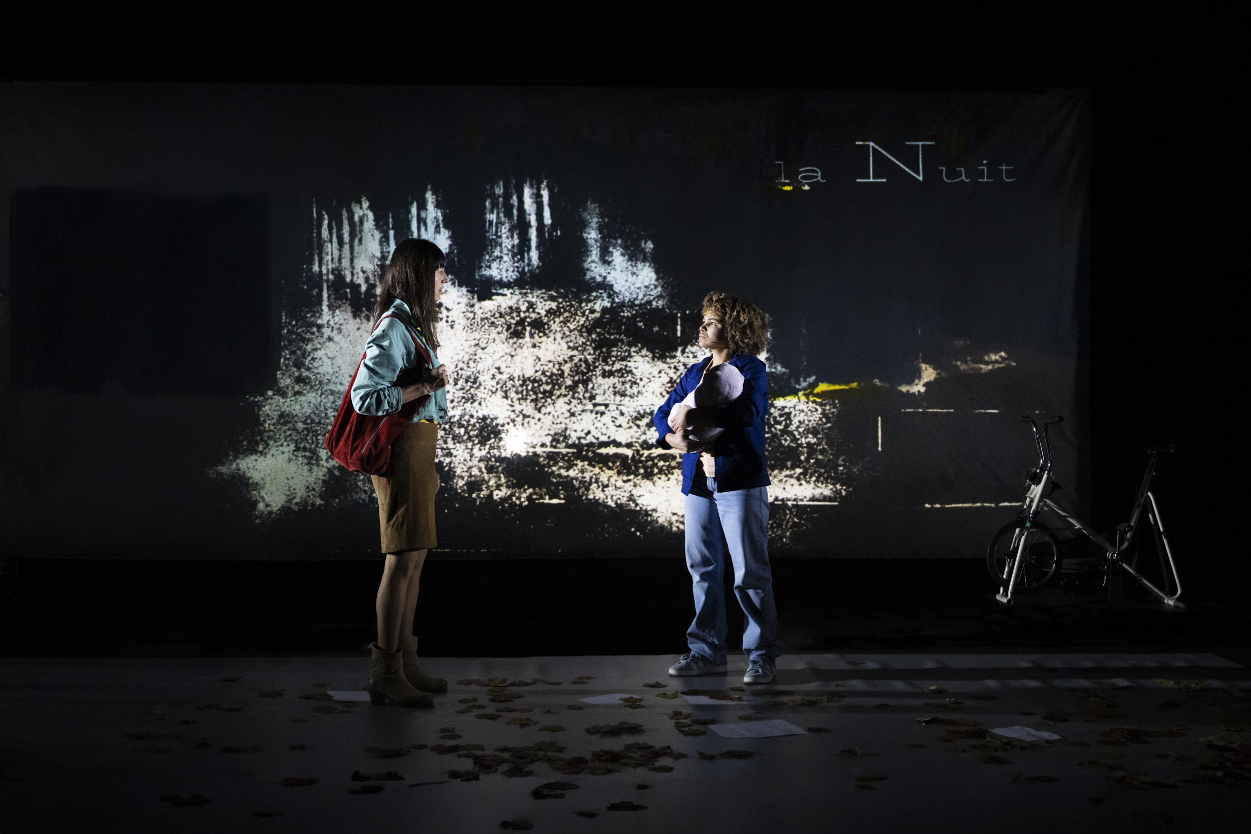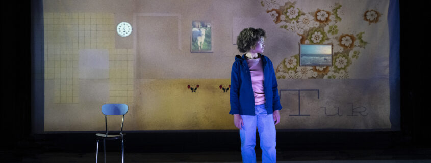 Sur un délicieux décor de toiles peintes déroulées manuellement par les interprètes, qui font défiler murs de maison, d’école ou de rue, soutenues par une création sonore riche et subtile, de belles projections – nuages, gouttes de musique/d’eau, mots à la craie… – éclairent le propos et enveloppent le spectacle d’onirisme, de douceur et de délicatesse. D’obstacles en moments partagés, d’incompréhensions en complicités, mère et fille vont cheminer l’une vers l’autre, et l’adulte vers son épanouissement, et l’enfant vers son enfance.