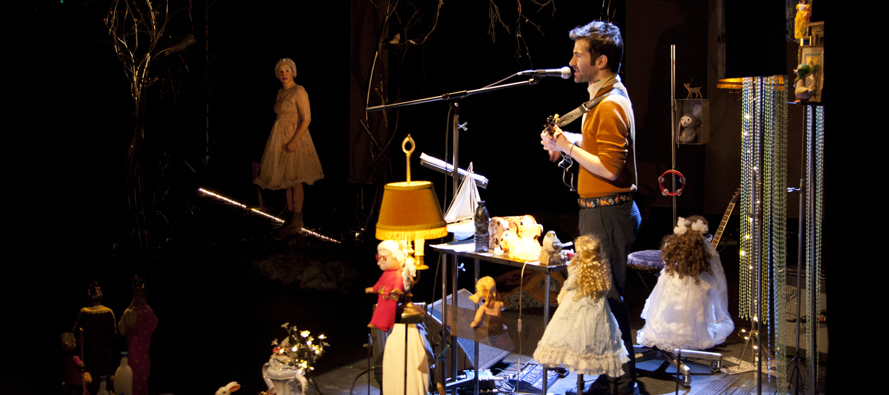 Sur scène, – magnifique scénographie signée Gaëlle Bouilly – c’est beau comme un arbre de noël quand on est enfant, comme une brocante fantasmatique, comme une féérie d’enfances anciennes, poupées en dentelles et boucles anglaises, maquette de bateau et boule à neige, Notre-Dame de Lourdes en plastique, landau 50’s, branchages et rideaux de perles.