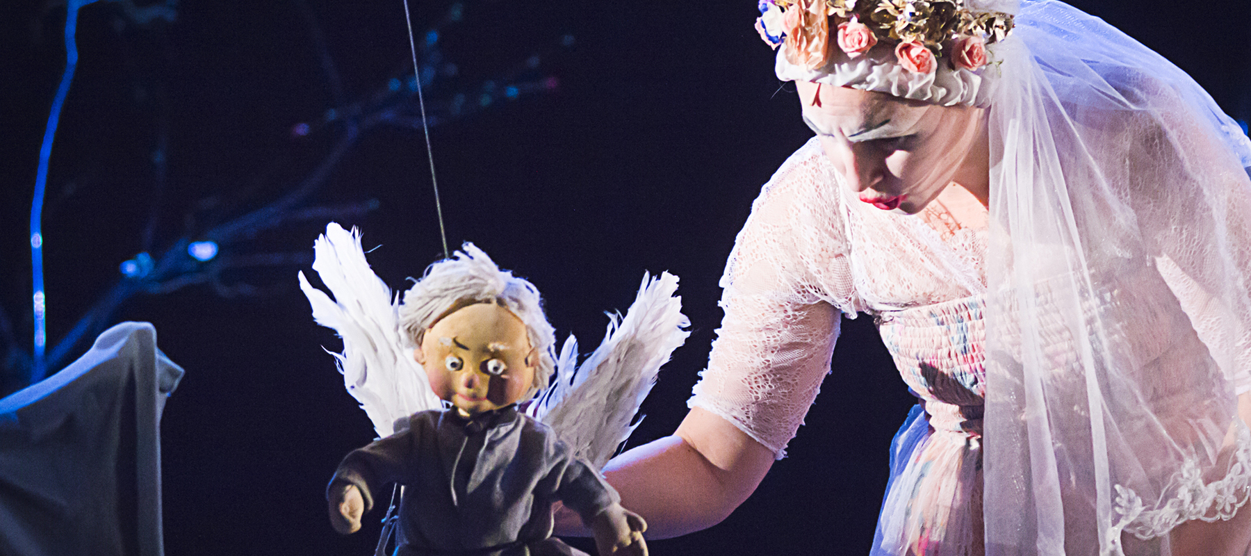 Grand-père, grand-mère, bande de potes et surtout « Mon enfant » prennent vie par la magie des marionnettes presque modestes, et d’une poésie rare, créées par Julien Aillet. L’espace s’anime, se découpe et se module sous les très jolies lumières d’Hervé Gary, qui savent trouer l’obscurité de pierres précieuses. Un fauteuil surgit sans qu’on s’en rende compte, une forêt descend des cintres, une Vierge tente d’apporter son expertise bi-millénaire : une atmosphère fantastique se glisse dans ce conte initiatique, qui aborde avec finesse et justesse, sans manichéisme et avec beaucoup de subtilités, les interrogations complexes du devenir-mère, du devenir-enfant.