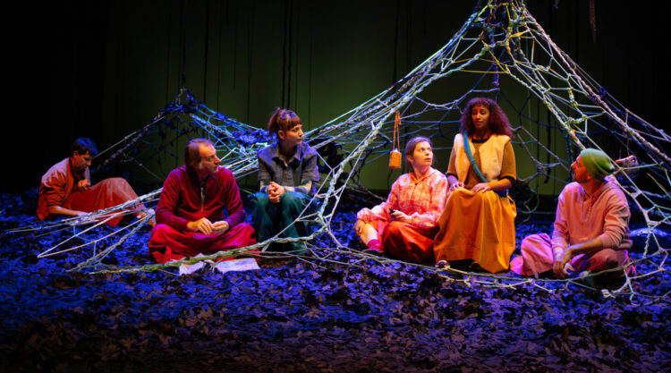 Au cœur du plateau se dresse un tipi de cordes joliment électrifié de fibre optique, qui évoque une aire de jeu d’enfant, une cabane, un filet de pêche mais aussi un réseau de connexions neuronales, grésillant-scintillant au gré de l’activité synaptique du groupe-organisme.