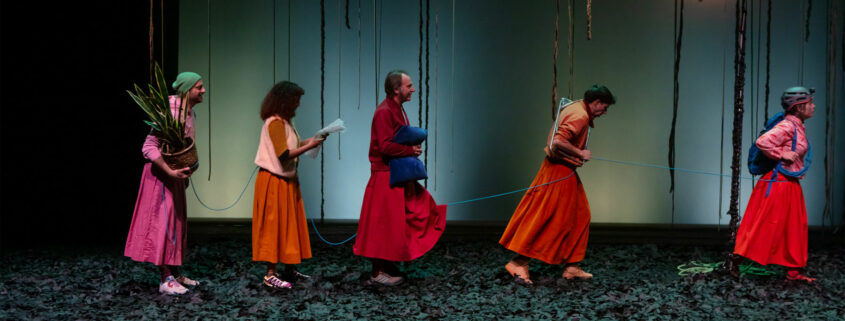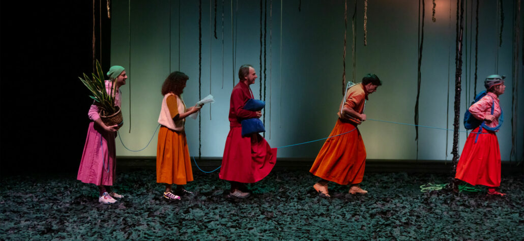 Dans une forêt d’humus noir et de lianes ondulantes, passe une cordée hétéroclite et vaguement égarée d’humain.es (+ une plante grasse) d’âges et de carnations diverses. Elles et ils sont vêtu.es de jupes et blousons couleur de pivoines et pavots, se ressemblant mais dissemblables, relié.es par un cordage comme les alpinistes affrontant de rudes montagnes.