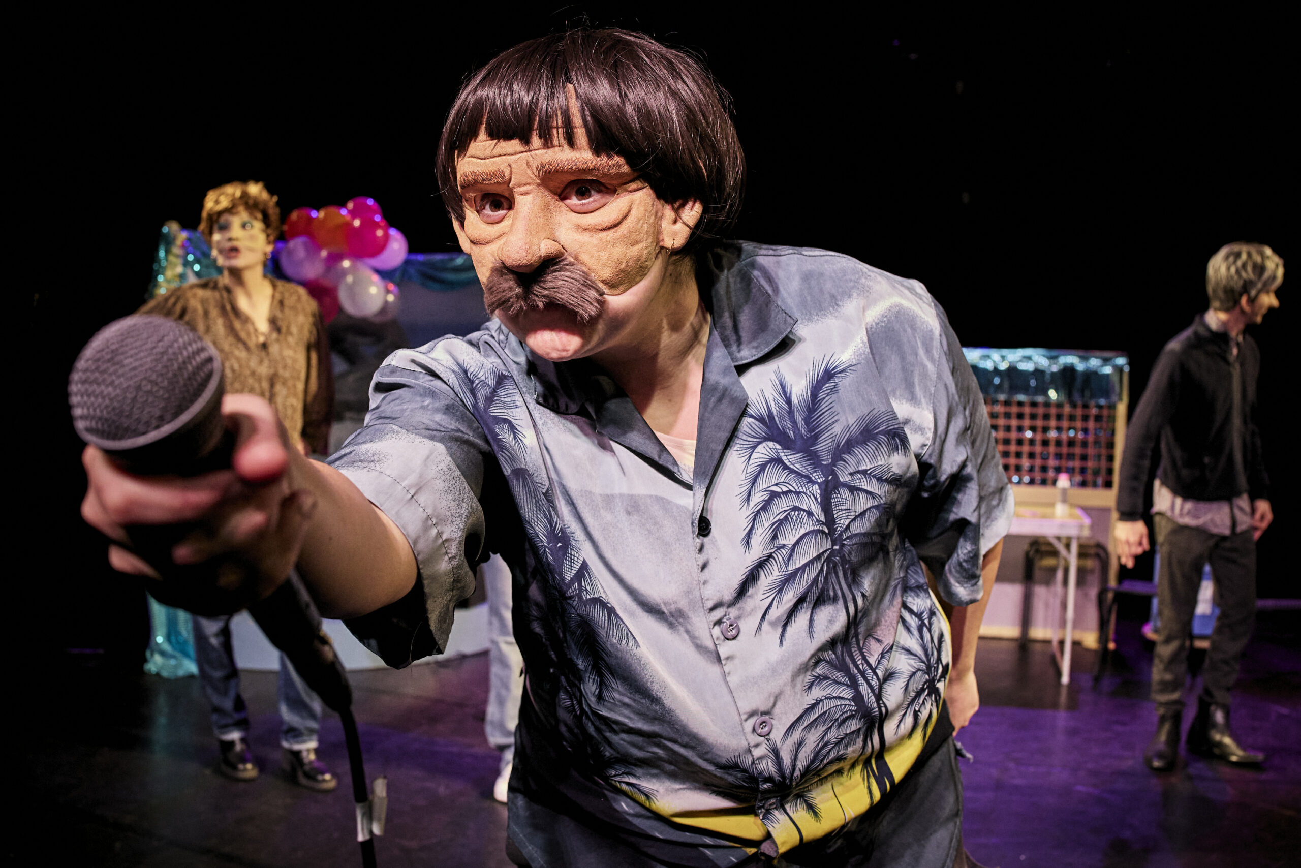 Dans un décor facétieux fourmillant de détails, Nusch Batut Guiraud, Mathilde Bellanger, Aurélien Fontaine, Louis Loutz, Myra Zbib sont dissimulés/exposés sous des masques de comedia très réussis, parés de costumes délicieusement inadaptés – sans être jamais ridicules pour autant, rien ne va parfaitement bien à personne. Pierre la méduse-mascotte du club des « Amis de la mer » philosophe dans son aquarium, en contrepoint méditatif à toute cette agitation. « Dans l’eau tout est calme, mais on est un peu seul, alors au local, je suis bien, je suis avec vous », résume la sage invertébrée.