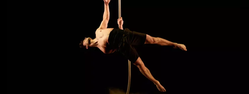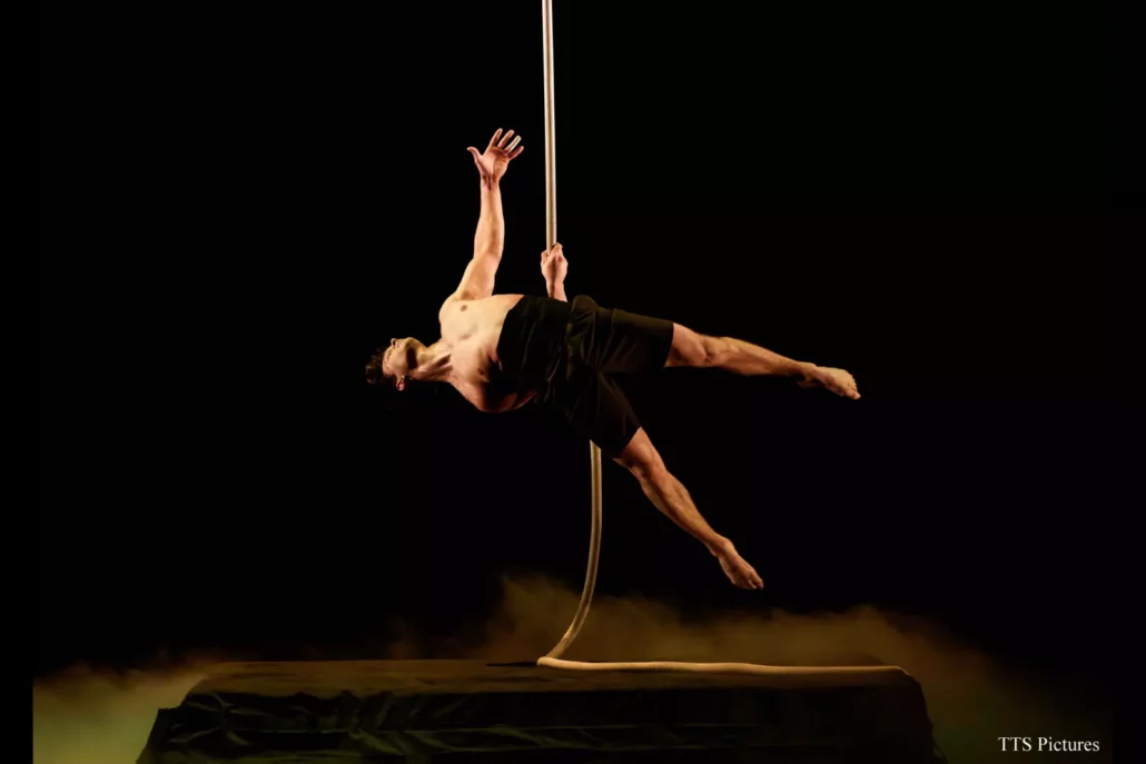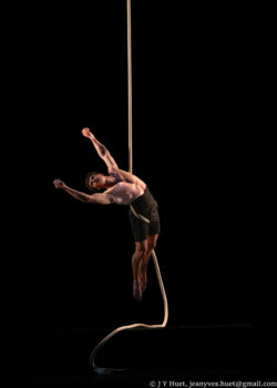 Une lumière dorée de soleil qui coule le long d’une unique corde tombant des cintres, un jeune homme presque indolent : Maksym Vakhnytskyi, merveilleux cordiste, aérien, spectaculaire, fait des prouesses comme on fait la sieste, avec des lenteurs et des langueurs de fin d’après-midi au soleil. Mykhailo Makarov – cou-de-pied de danseur, grand écart de ballerine, musculature d’Atlas, souplesse de liane, corps gainé et sourire de môme – tel l’albatros est lourd et bien maladroit au sol et s’envole dès qu’il est perché sur ses cannes d’équilibre. Au cerceau aérien, Artem Kreksha se fait perruche contorsionniste, petit piaf sur son perchoir défiant les lois de la gravité et de la physiologie, pliant sa carcasse en des angles improbables, suspendu par le bout des pieds…